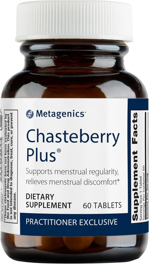 Menstrual Relief Support: Chasteberry Plus combines chasteberry and black cohosh to help maintain menstrual regularity, ease discomfort, and support reproductive health* Ashwagandha Amount: Each tablet contains 60 mg of Ashwagandha root extract, making this a special women's formula* Period Cramps Relief Formula: The product features a special blend of chasteberry, black cohosh, and ashwagandha to support women's reproductive health* Chasteberry Plus Specifications: Each container includes 60 vegetarian, gluten-free, and non-GMO tablets Designed by Nature, Trusted by Doctors: At Metagenics, we connect people with products that help them live healthier, happier lives Metagenics' Chasteberry Plus is a specially designed supplement to support women's reproductive health and provide relief from menstrual cramps.* Our unique formula combines chasteberry and black cohosh, both known for their beneficial properties in supporting menstrual regularity and easing discomfort, along with ashwagandha.*Each tablet contains 100 mg of chasteberry fruit extract, known for its supportive role in menstrual health.* Alongside this, we've included 40 mg of black cohosh root and rhizome extract, standardized to 2.5 percent total triterpene glycosides. This powerful combination works to provide menstrual relief and support reproductive health in women.*The addition of 60 mg of ashwagandha root extract, a revered herb in traditional medicine, completes our formula. All these ingredients are non-GMO, gluten-free, and suitable for vegetarians, ensuring that Chasteberry Plus is a health-conscious choice. Trust Metagenics' Chasteberry Plus to provide the support you need for menstrual regularity and relief from menstrual cramps.*With a heritage of breakthrough science, innovative products, unsurpassed quality, practitioner education, and dedicated partnerships, it is clear why Metagenics has become one of the most trusted health and wellness brands worldwide. For over 40 years Metagenics has developed high-quality, science-based nutritional supplements, medical foods, and lifestyle programs to support the growing number of people seeking to improve their health and achieve their wellness goals.