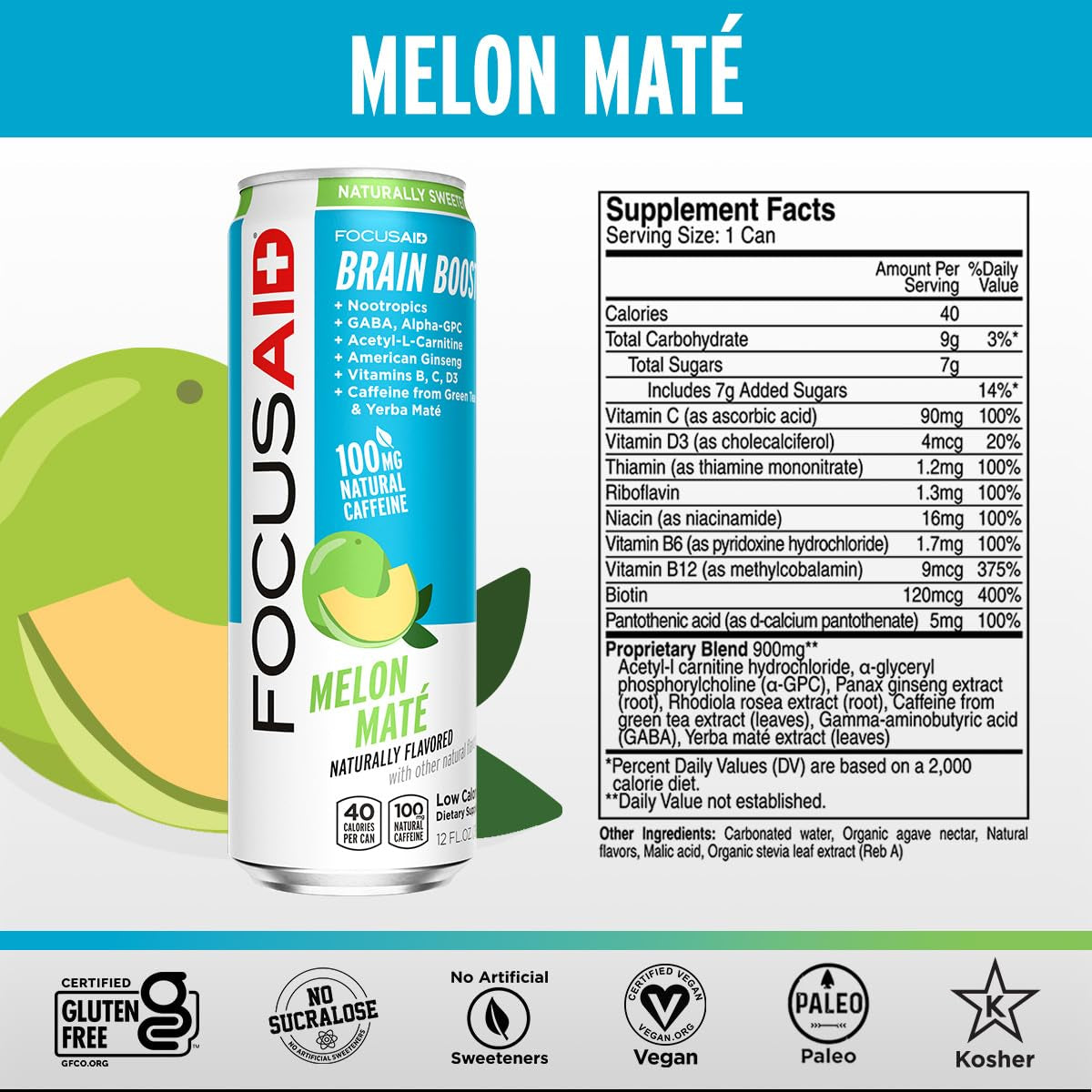 - Low Calorie to help you ditch the sugar! FOCUSAID is only 45 refreshing calories per can, naturally sweetened with just a pinch of raw organic agave—lightly carbonated with a "Melon Maté" flavor.