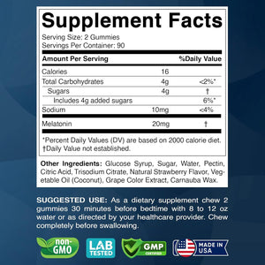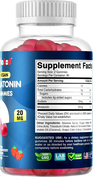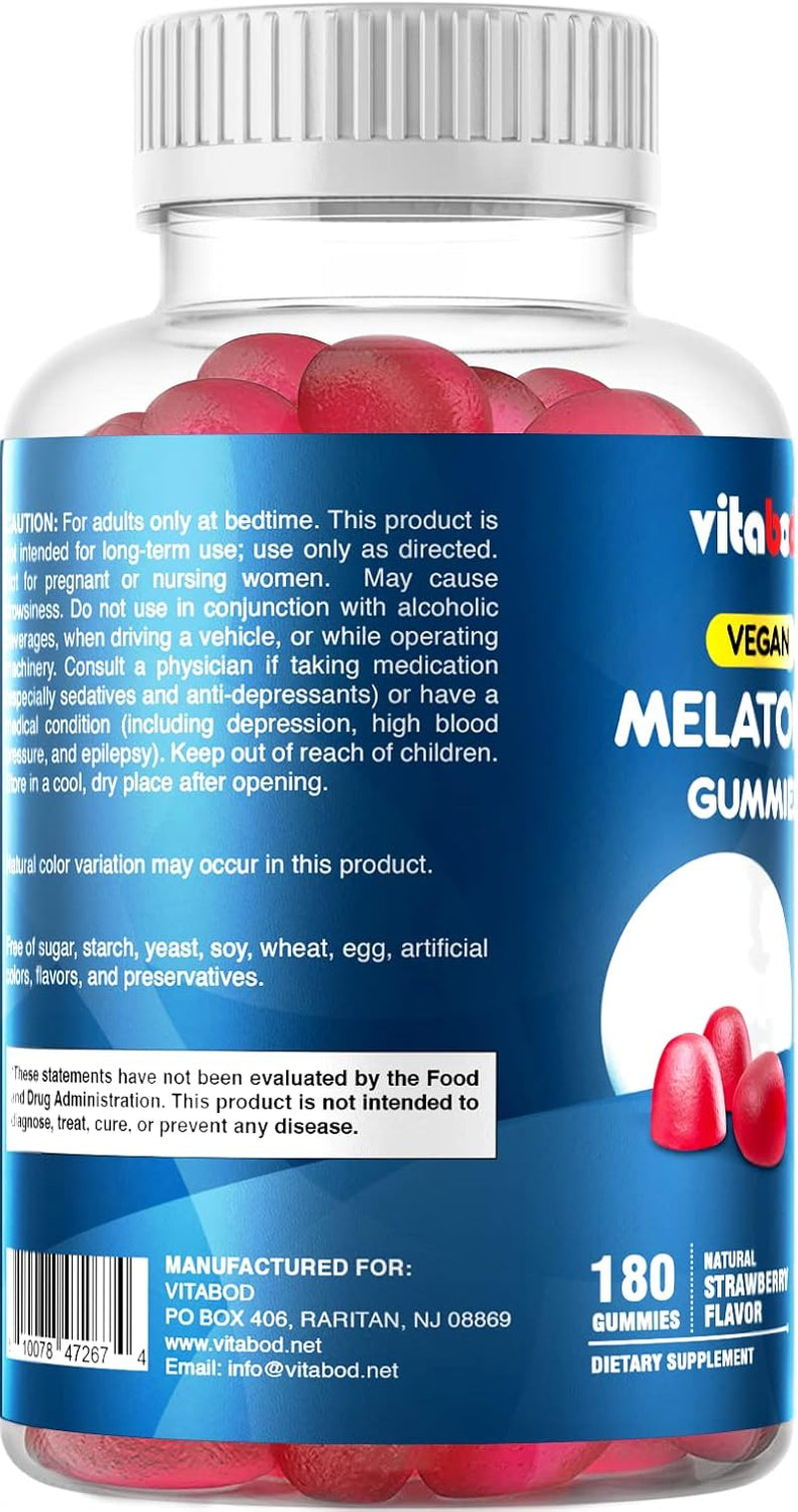 Melatonin 20mg - 180 Vegan Gummies - Drug Free - Natural Strawberry Flavor - Vegetarian, Non-GMO, Gluten Free by Vitabod Free of Yeast, Soy, Corn, Wheat, Egg, Artificial Colors, Flavors & Preservatives.