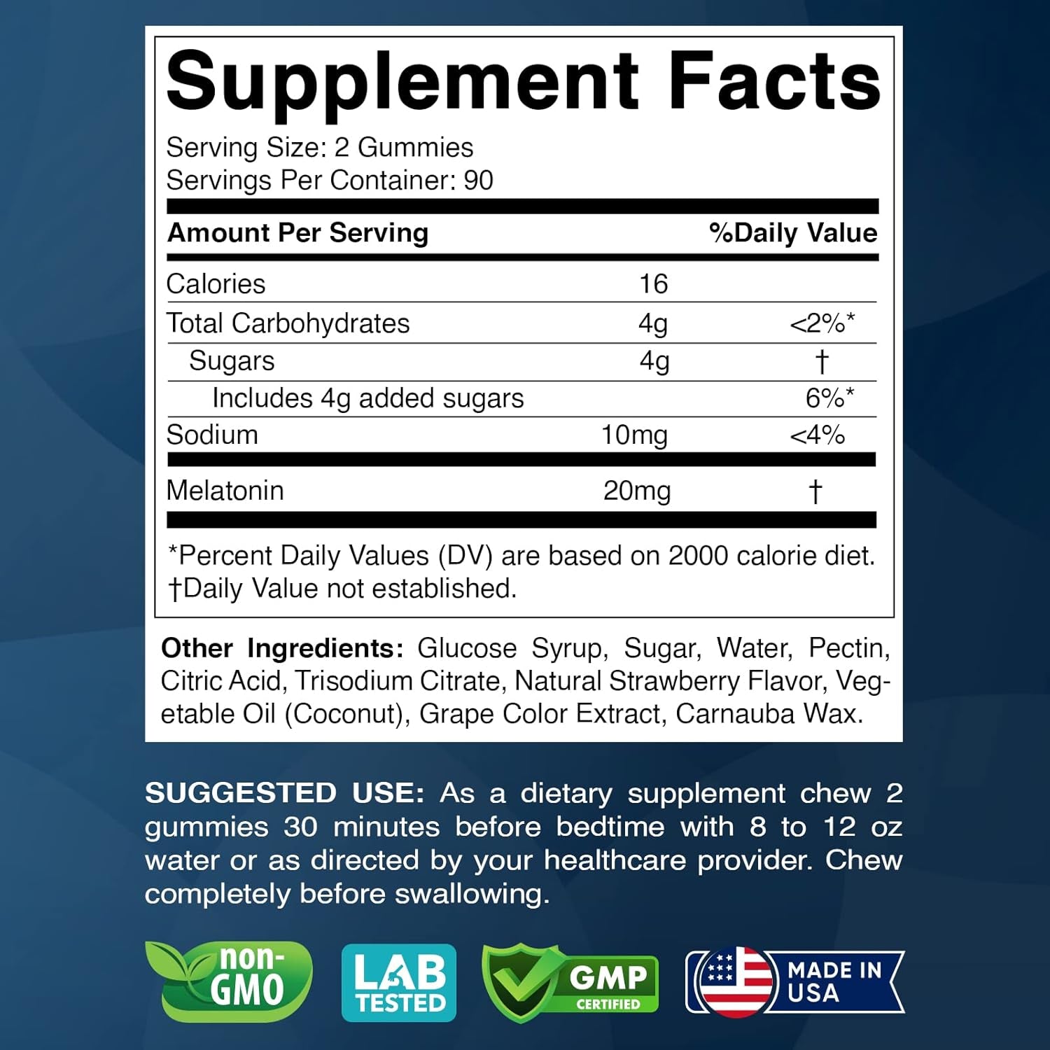 Melatonin 20Mg Gummies - 180 Count - Drug Free - Natural Strawberry Flavor - Vegetarian, Non-Gmo, Gluten Free (2 Bottles)