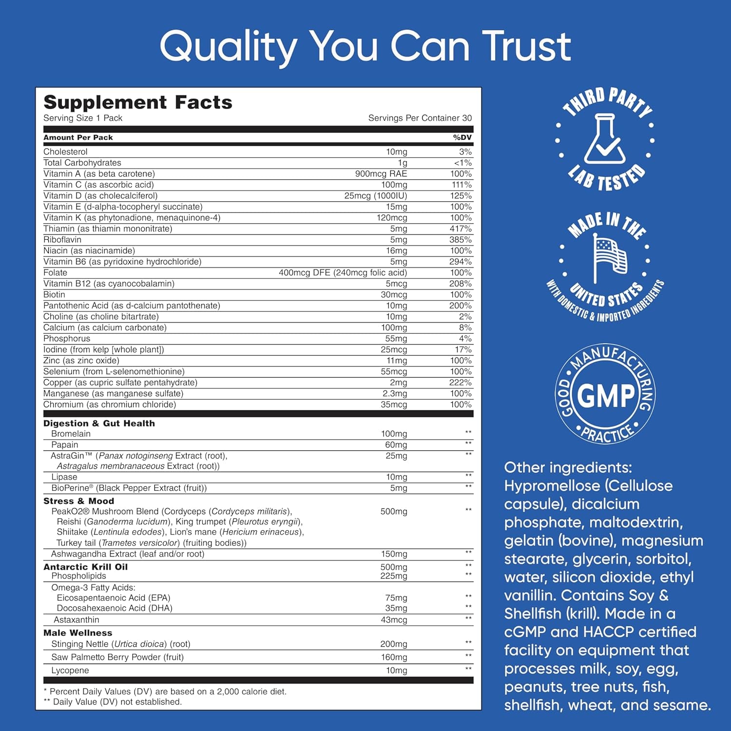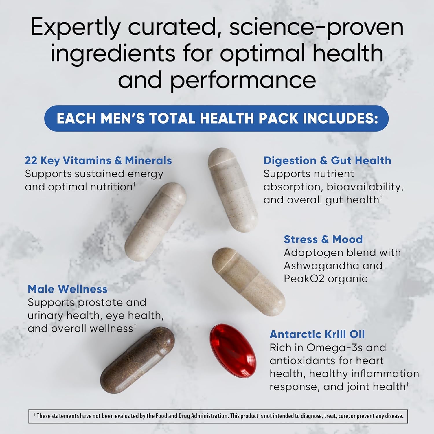 Men'S Total Health Pack Daily Multivitamin Supplement, Energy, Stress Support, Krill Oil, 22 Key Vitamins & Minerals, Vit D, C, B12, E, A, B6, K, Biotin, Zinc, Astaxanthin (30 Pack)