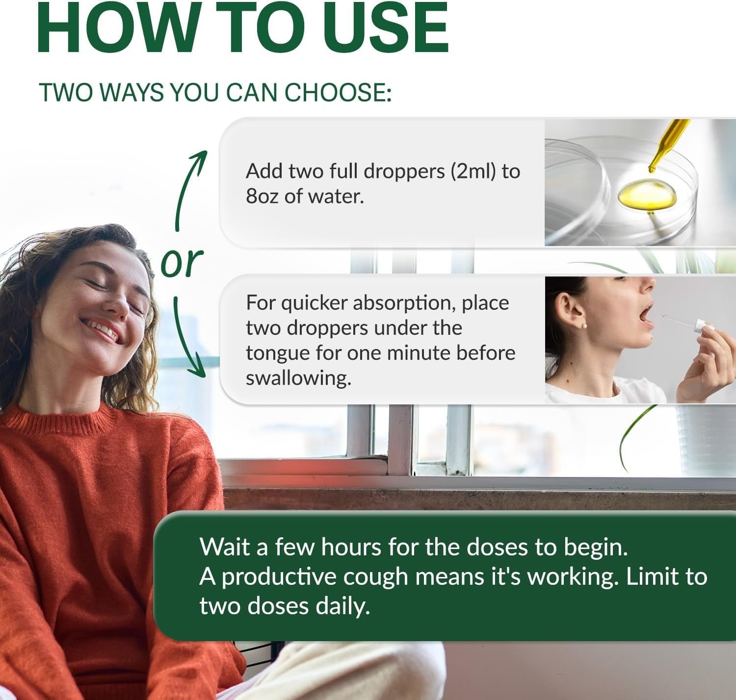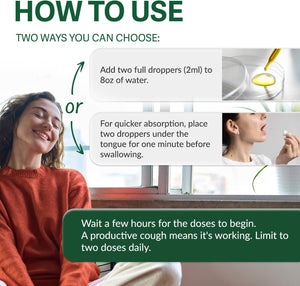 - ☘️ Easy To Use - Add two full droppers (2ml) to 8oz of water. For faster absorption, place two droppers under the tongue for one minute before swallowing. Wait a few hours for the doses to begin. A productive cough means it's working. Do not take more than two doses a day.