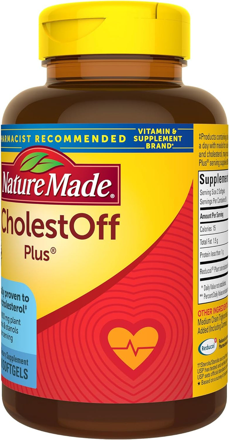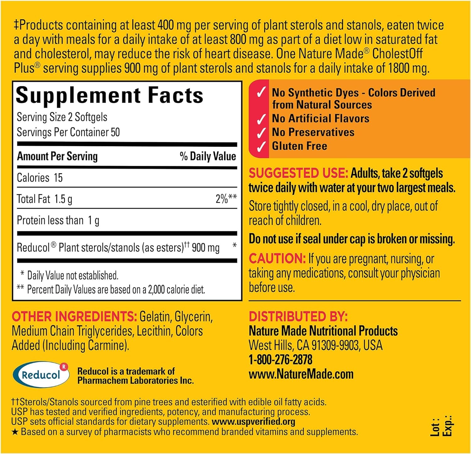 Nature Made CholestOff Plus is a dietary supplement that helps support a healthy heart and lowers dietary cholesterol (1). it lowers cholesterol by reducing the absorption of dietary cholesterol into the bloodstream (1). Adults, take two of these lower cholesterol supplements twice daily with water at your two largest meals for a total of 1800 mg of plant sterols and stanols (2) per day to lower dietary cholesterol. Nature Made supplements are quality you can trust. USP has tested and verified ingredients, potency and manufacturing process. USP sets official standards for dietary supplements. Visit the USP verified website for more information. (1)Products containing at least 400 mg per serving of plant sterols and stanols, eaten twice a day with meals for a daily intake of at least 800 mg as part of a diet low in saturated fat and cholesterol. One serving of Nature Made CholestOff Plus supplies 900mg of plant sterols and stanols for a daily intake of 1800mg. (2)Sterols/stanols sourced from pine trees and esterified with edible oil fatty acids. *Based on a survey of pharmacists who recommend branded vitamins and supplements. it is a trademark of Pharmachem Laboratories Inc.
