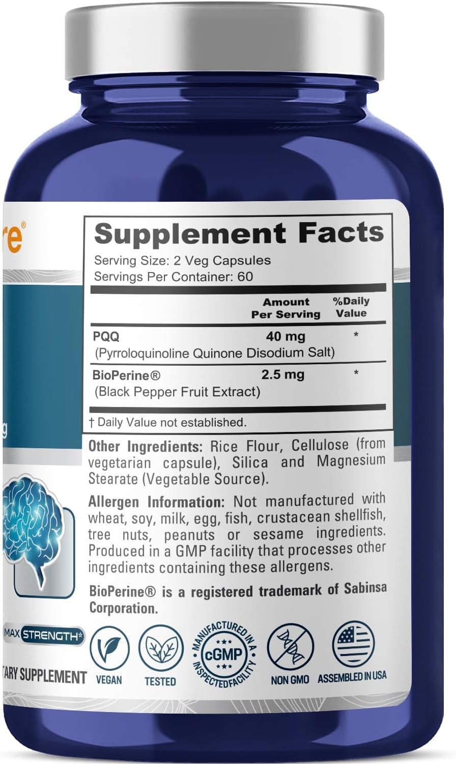 Nusapure PQQ Supplement 40 Mg, 120 Veggie Capsules, Non-Gmo, Pyrroloquinoline Quinone Disodium Salt, Bioperine