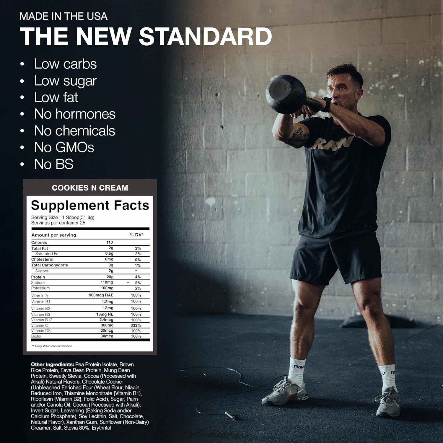 - Cookies N Cream Vegan Protein: RAW Nutrition brings you our ultra-premium Vegan Protein, fortified with vitamins to pack a serious nutrient-dense punch. Each scoop packs 20 grams of the highest quality plant-based protein with the all-natural sweetener Sweetly Stevia to ensure superior taste and digestibility. 25 servings.