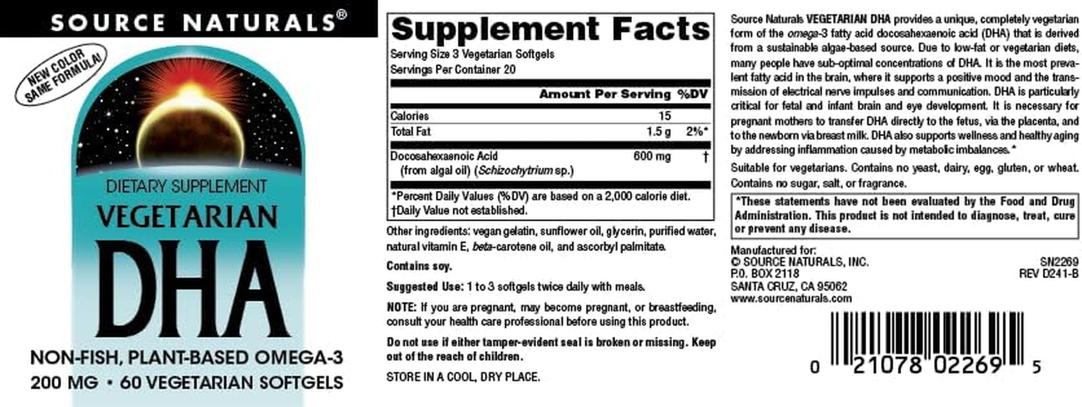 - Source Naturals Vegetarian DHA provides a unique, completely vegetarian form of the omega-3 fatty acid docosahexaenoic acid (DHA) that is derived from a sustainable algae-based source.