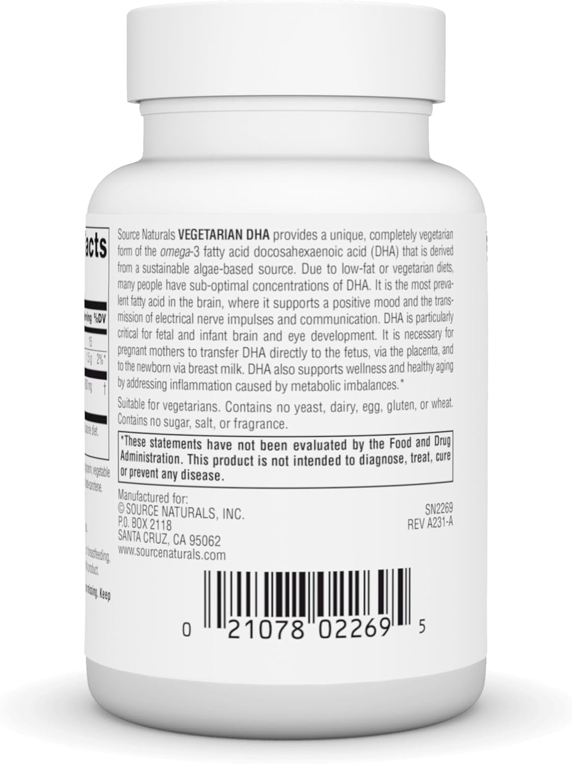 Source Naturals Vegetarian DHA provides a unique, completely vegetarian form of the omega-3 fatty acid docosahexaenoic acid (DHA) that is derived from a sustainable algae-based source. Due to low-fat or vegetarian diets, many people have sub-optimal concentrations of DHA. It is the most prevalent fatty acid in the brain, where it supports a positive mood and the transmission of electrical nerve impulses and communication. DHA is particularly critical for fetal and infant brain and eye development. It is necessary for pregnant mothers to transfer DHA directly to the fetus, via the placenta, and to the newborn via breast milk. DHA also supports wellness and healthy aging by addressing inflammation caused by metabolic imbalances.*