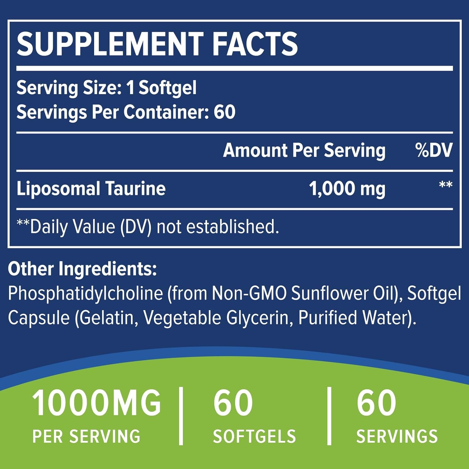Taurine 1000Mg - Liposomal Taurine Amino Acid Supplement for Heart, Liver, and Brain, Longevity, Exercise - High Absorption, Vegan & Gluten Free (60 Softgels - 1 Pack)